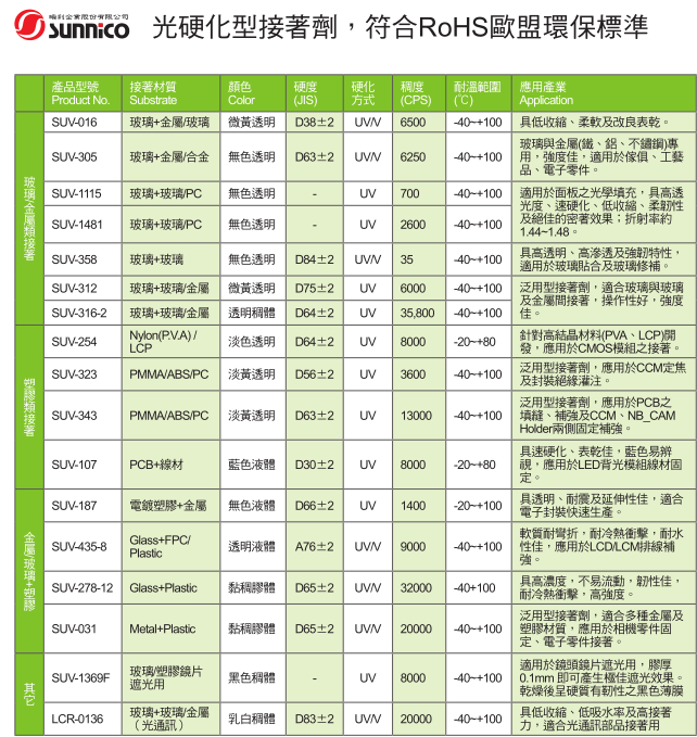 螺絲固定劑 黃/白膠 硅膠接著劑 環氧樹脂系列AB膠 UV膠 熱熔膠/PUR 三防膠 環保散熱膏 高性能溶劑型接著劑 瞬間接著劑/表面處理劑